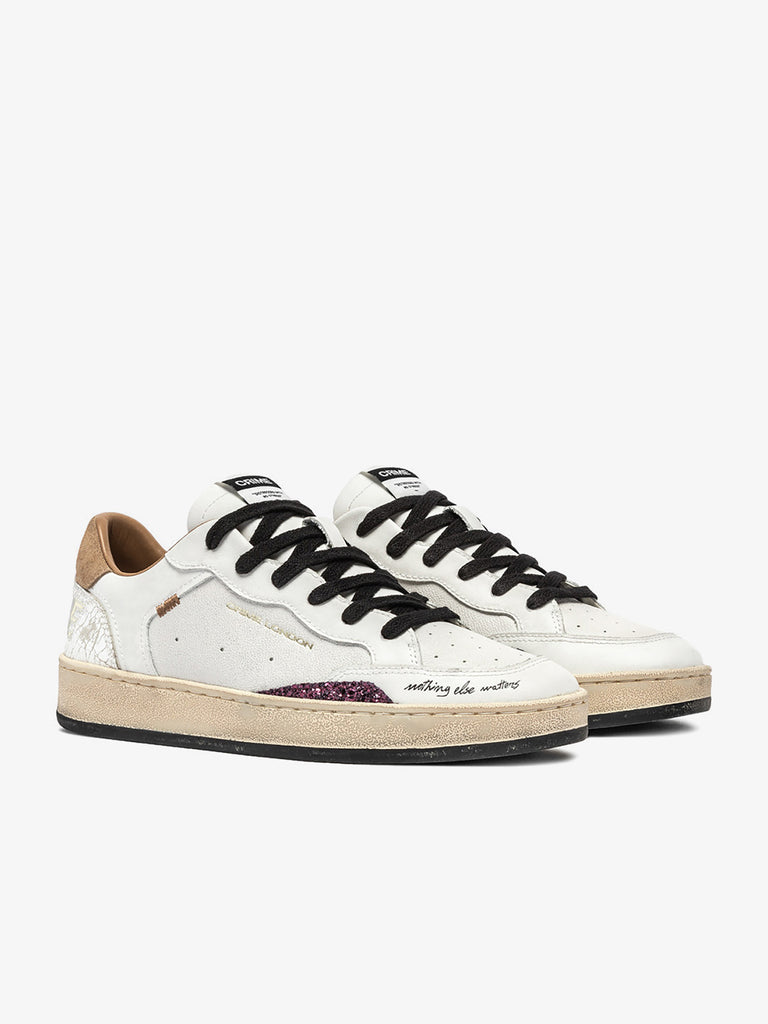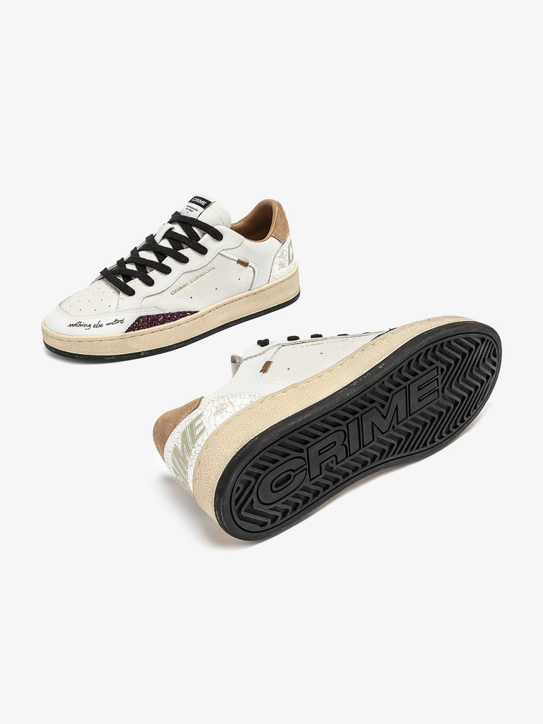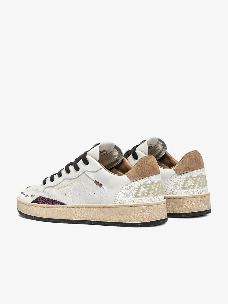 Details: Sneaker aus hochwertigen Materialien Made in Italy. Obermaterial aus weißem Leder mit cremefarbenem Wildleder und Ponyfell, platinfarbene Knisterfoliendetails. Absatz in antikem Beige. Absatz mit CRIME-Logo. Zunge aus weißem Leder mit Logoetikett aus Stoff. Schwarze Schnürung.