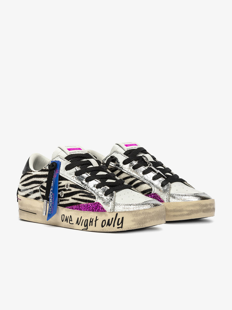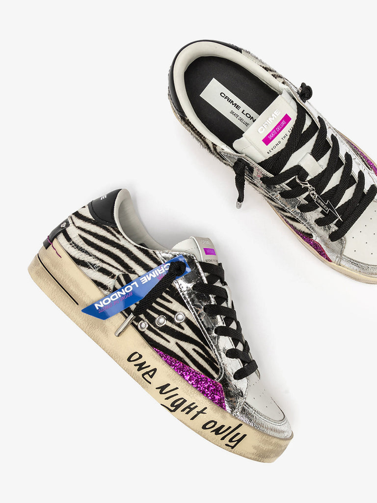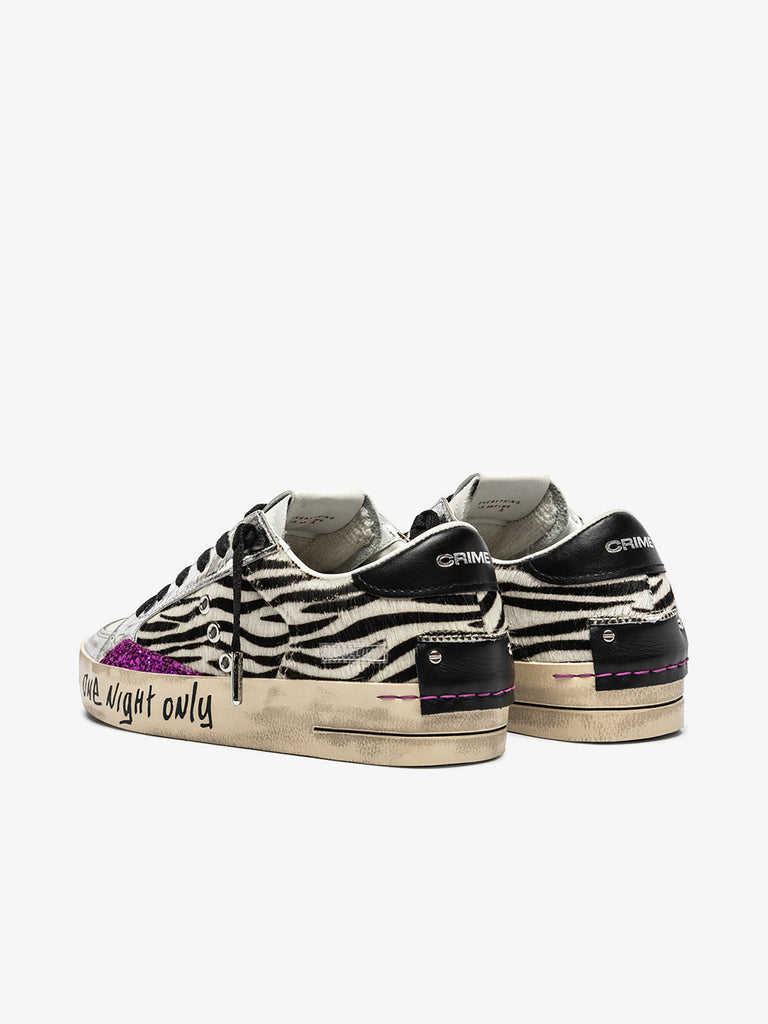 Details: Sneaker aus hochwertigen Materialien Made in Italy. Obermaterial aus Leder mit laminierten Profilen, schwarzer Ferse und Zebra-Details. Distressed-Effekt auf Obermaterial und Sohle. Zunge mit Lederetikett mit Logo und "One Night Only"-Schriftzug. Lederaufnäher auf der Rückseite, mit Mikroschrauben befestigt. Schnürsenkel. Einzigartiges Logo-Etikett aus Gummi. Innenfutter aus Leder und Stoff. Elfenbeinfarbene umwickelte Kunstledersohle mit Used-Optik.