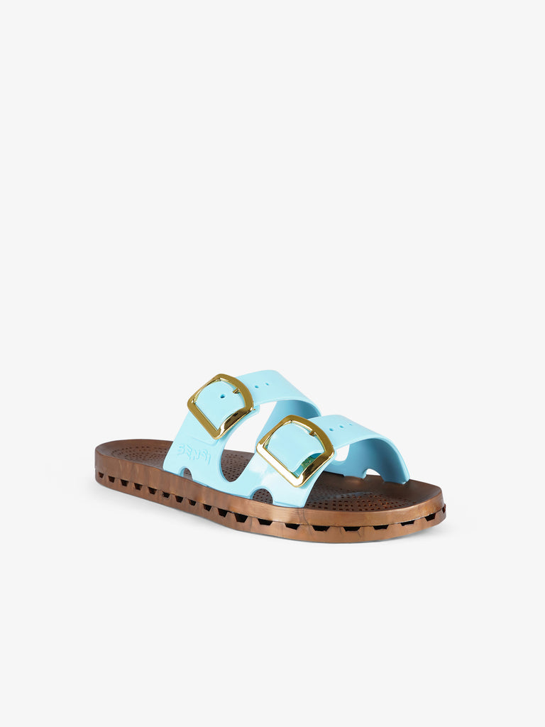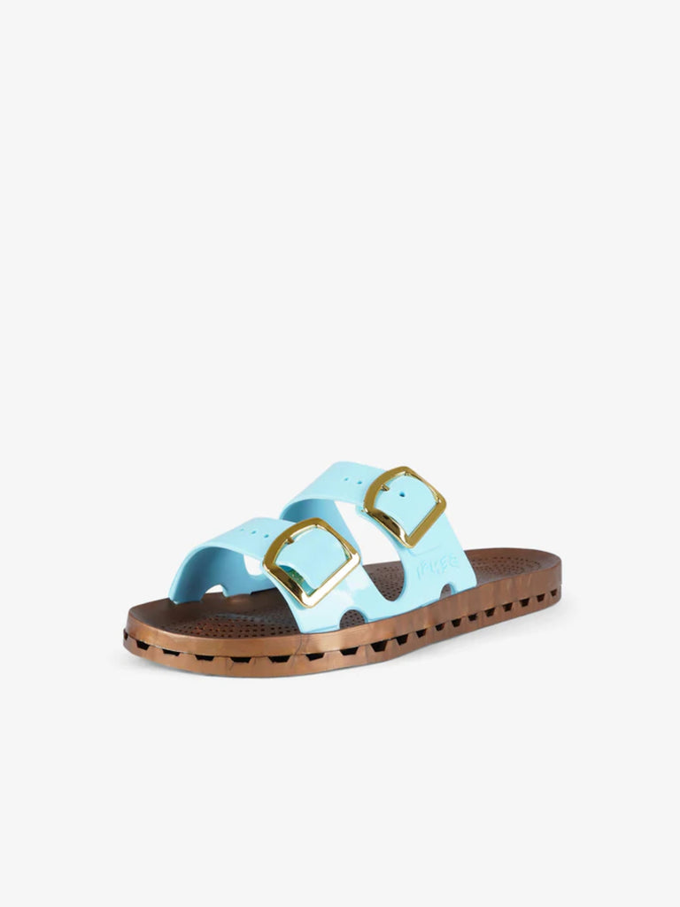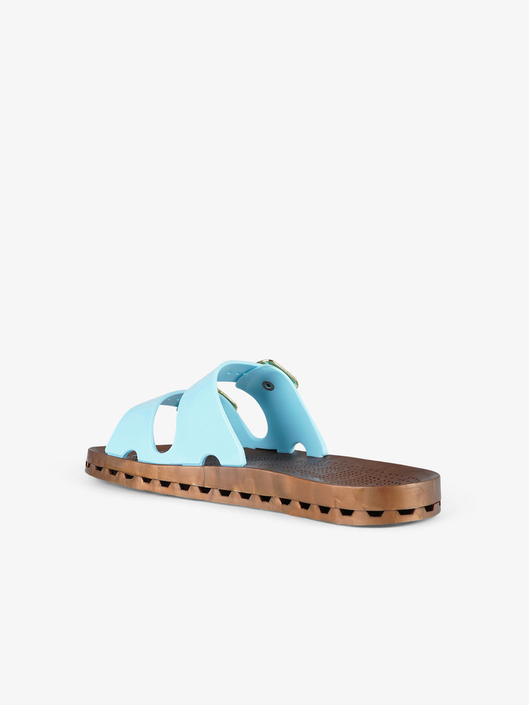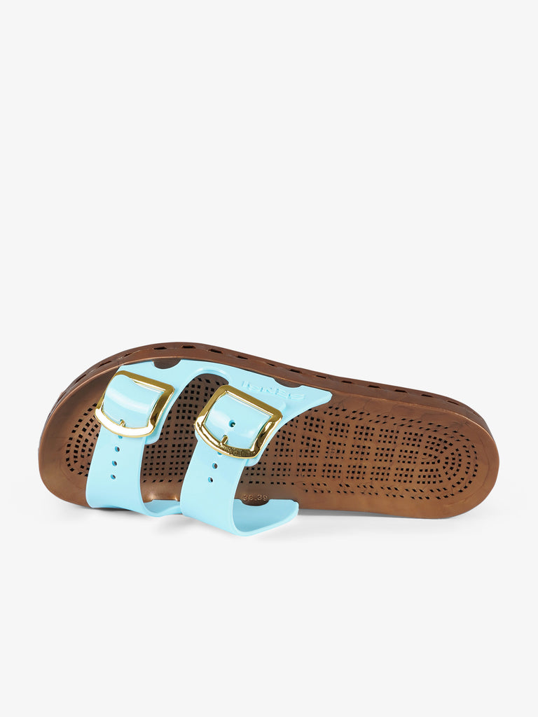 Details: Die Jolla Prestigio zeichnen sich durch eine spezielle PVC-Sohle aus, die durch die mechanische Verbindung einer perforierten Innensohle mit einem Boden mit Abflusskanälen entsteht. Durch die Löcher in der Sohle, die mit den Kanälen im Boden verbunden sind, kann das Wasser abfließen, das durch die Schlitze entlang des Umfangs der Sandale nach außen geleitet wird.