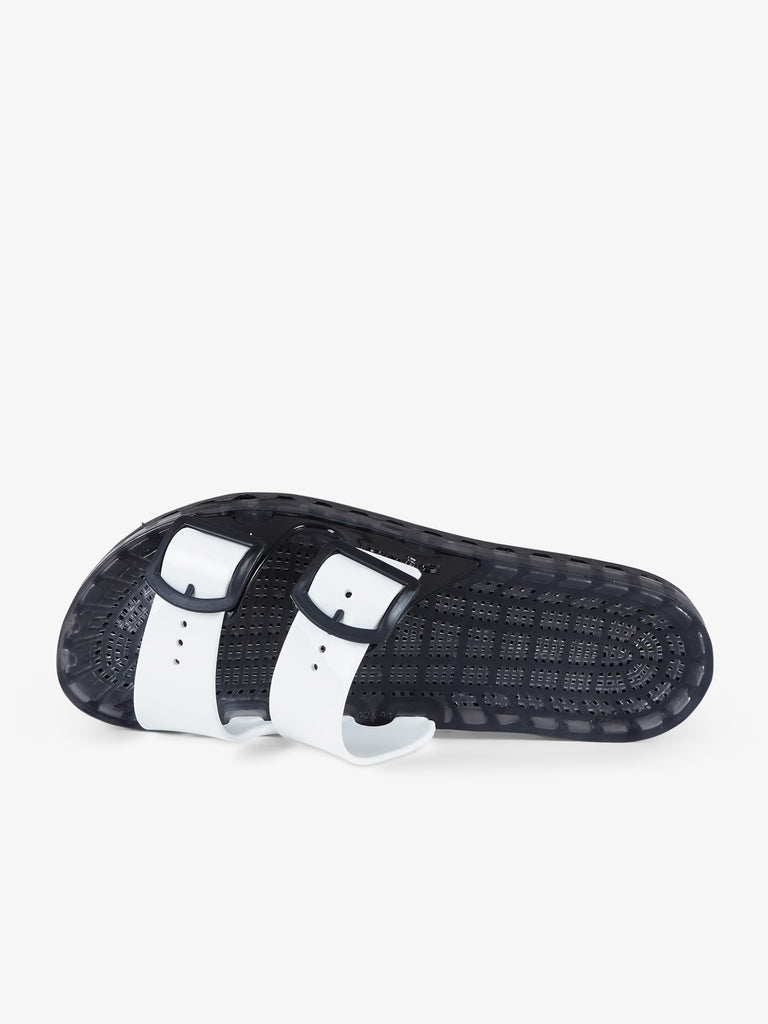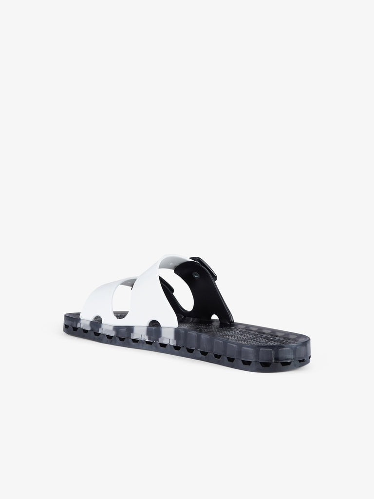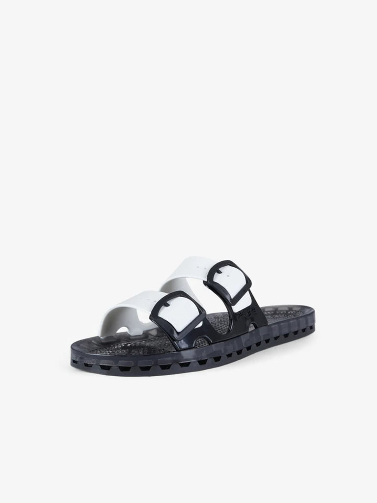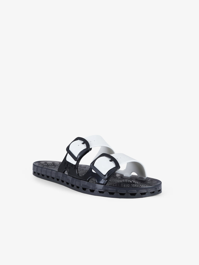 Details: Die La Jolla Grey Fluo zeichnen sich durch eine spezielle PVC-Sohle aus, die durch die mechanische Verbindung einer perforierten Einlegesohle mit einem Boden mit Abflusskanälen entsteht. Durch die Löcher in der Innensohle, die mit den Kanälen im Boden verbunden sind, kann das Wasser abfließen, das durch die Schlitze entlang des Umfangs der Sandale nach außen abgeleitet wird. Die Sandalen sind vollständig recyclingfähig, sobald sie das Ende ihrer Nutzung erreicht haben, und können bis zu 100 Prozent recycelt werden.