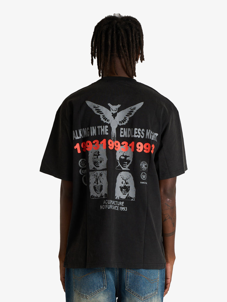 Details: Designed with a relaxed, oversized boxy fit, this T-shirt offers a comfortable streetwear silhouette. The striking back graphic combines a layered collage of vintage-style faces, bold typography and crisp symbols to create a powerful and chaotic visual story.