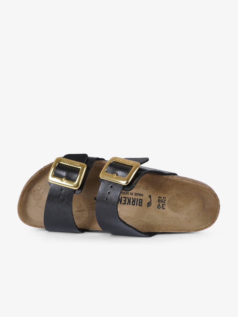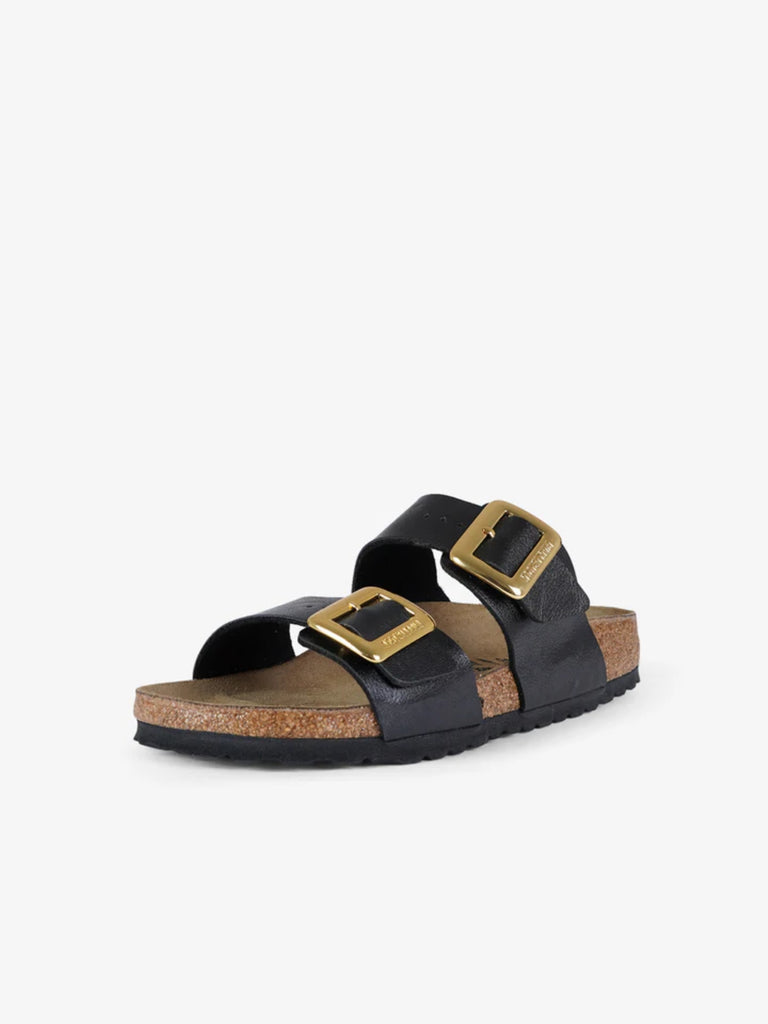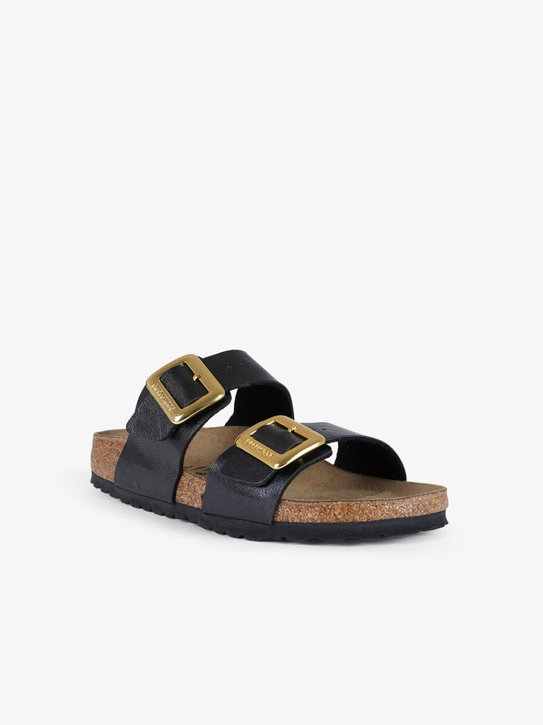 Details: The BIRKENSTOCK Sidney is proof that functionality and design are not mutually exclusive. With its two thin straps, it will thrill all fashion-conscious and comfort-conscious women. The thick, shiny, slightly rounded buckle is a special stylish touch. The upper is made of Birko-Flor®, a wear-resistant, leather-friendly synthetic material, and features a brilliant lacquered finish.