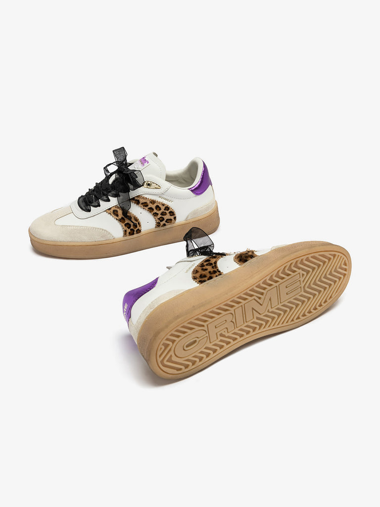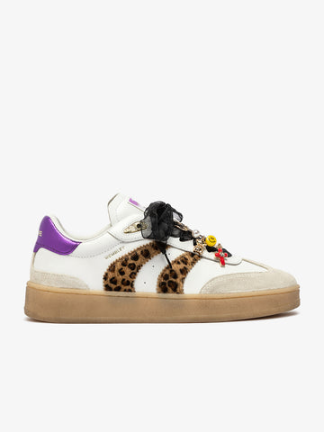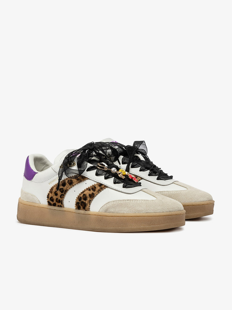 Details: Sneaker made of premium quality materials Made in Italy. White leather upper with removable accessory, leo print pony skin details. Purple laminated leather heel tab. White leather tongue. Black satin laces. Double black cotton lace. Leather and textile lining. Honey-colored rubber sole.