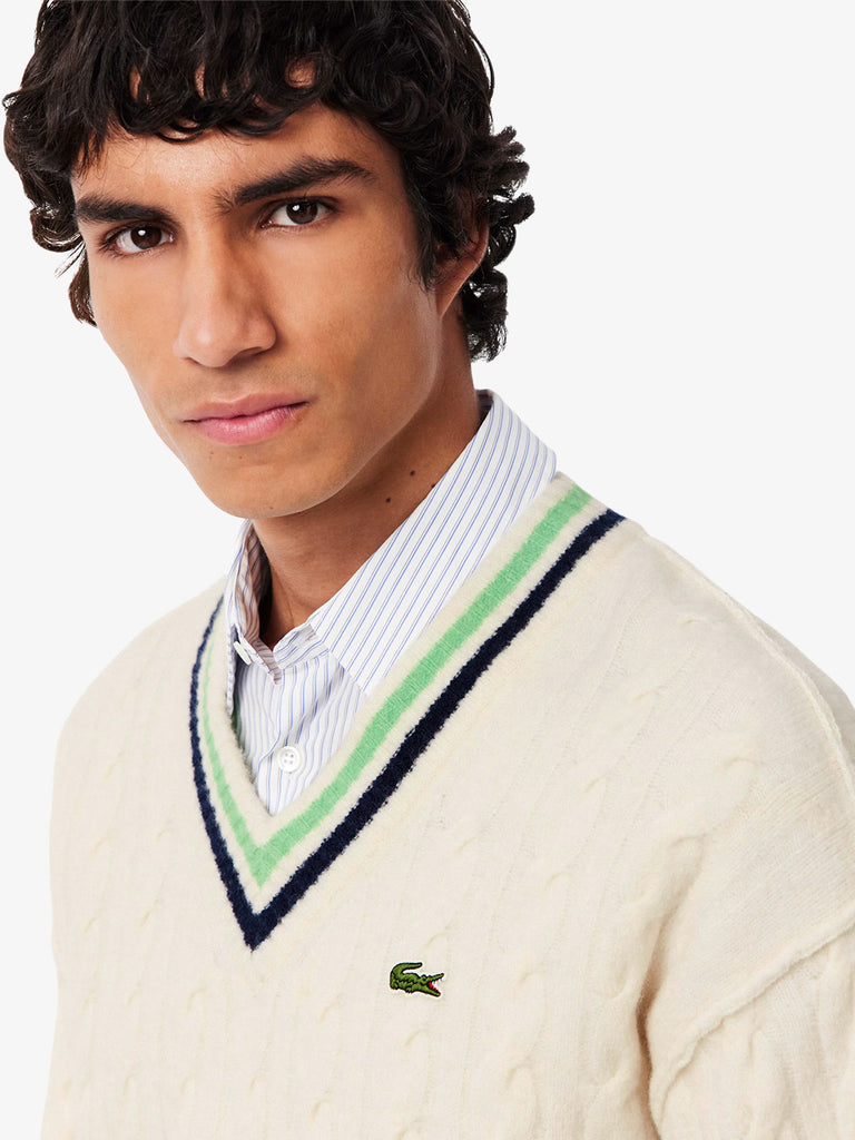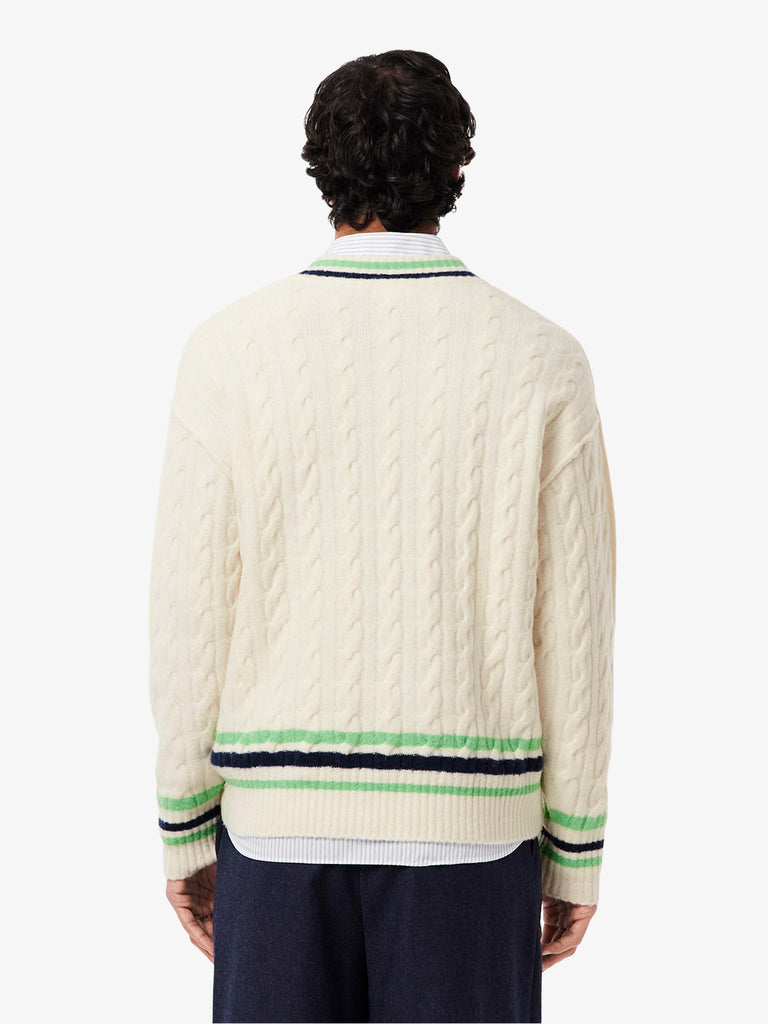 Details: A new and elegant take on the essential Lacoste tennis sweater, made especially for winter. Made of a soft, fluffy yarn for a soft, textured feel, with cable-knit details and iconic colorful stripes. An authentic and traditional style, finished with a distinctive embroidered crocodile.