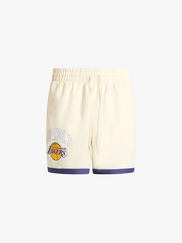 Details: LA Lakers NBA Team Logo Shorts. LA Lakers logo with LA wordmark on right leg. New Era flag embroidered on left pocket. Front pockets