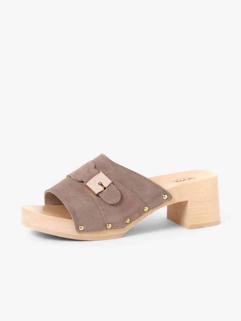 Details: Pescura is the original wooden clog made by Scholl, a true icon of the 1970s and a must-have to give a retro touch to any outfit. It is designed and made entirely in Italy with high quality materials such as the pure beech wood base and fully adjustable leather upper. In our reinterpretation of the original Pescura, the wide heel gives the shoe a vintage style.