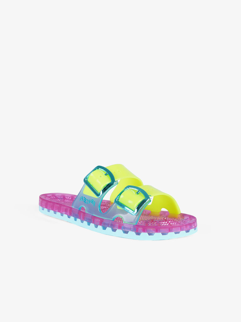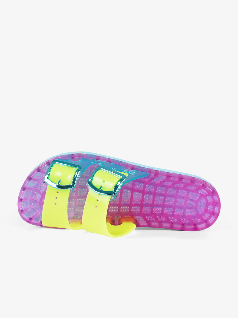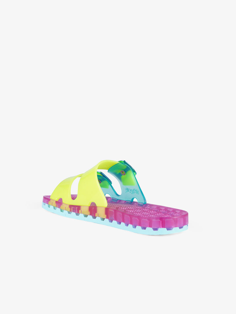 Details: They have a dominant feature; the special PVC sole obtained by mechanically coupling a perforated insole, to a bottom with runoff channels. The holes on the insole communicating with the channels in the bottom, allow water to drain away, which through the slits along the perimeter of the sandal is expelled to the outside. The sandals are fully compliant to be recycled once they reach the end of their use with up to 100 percent complete recycling.