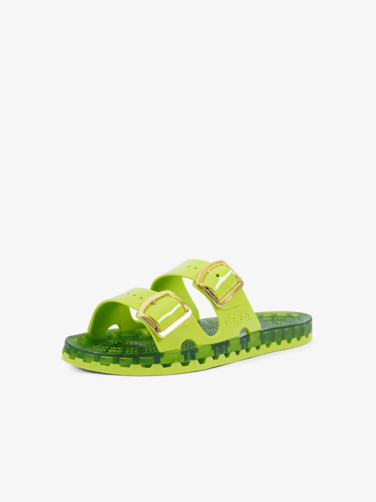 Details: They have a dominant feature; the special PVC sole obtained by mechanically coupling a perforated insole, to a bottom with runoff channels. The holes on the insole communicating with the channels in the bottom, allow water to drain away, which through the slits along the perimeter of the sandal is expelled to the outside. The sandals are fully compliant to be recycled once they reach the end of their use with up to 100 percent complete recycling.
