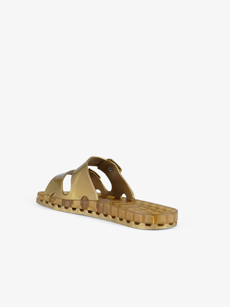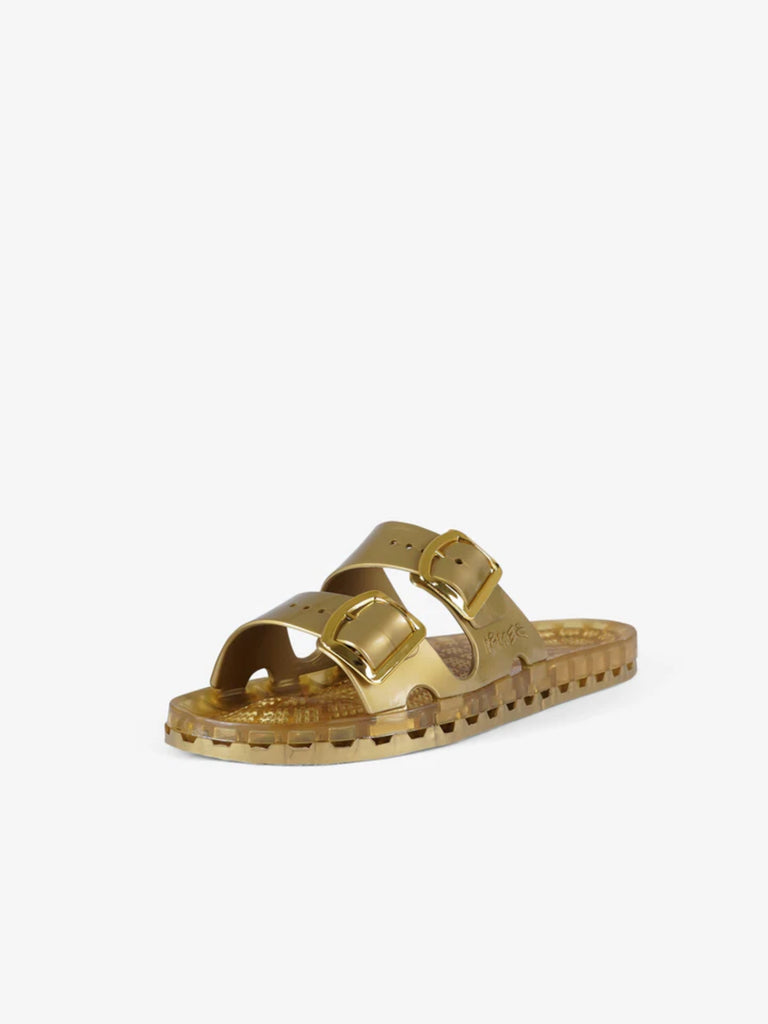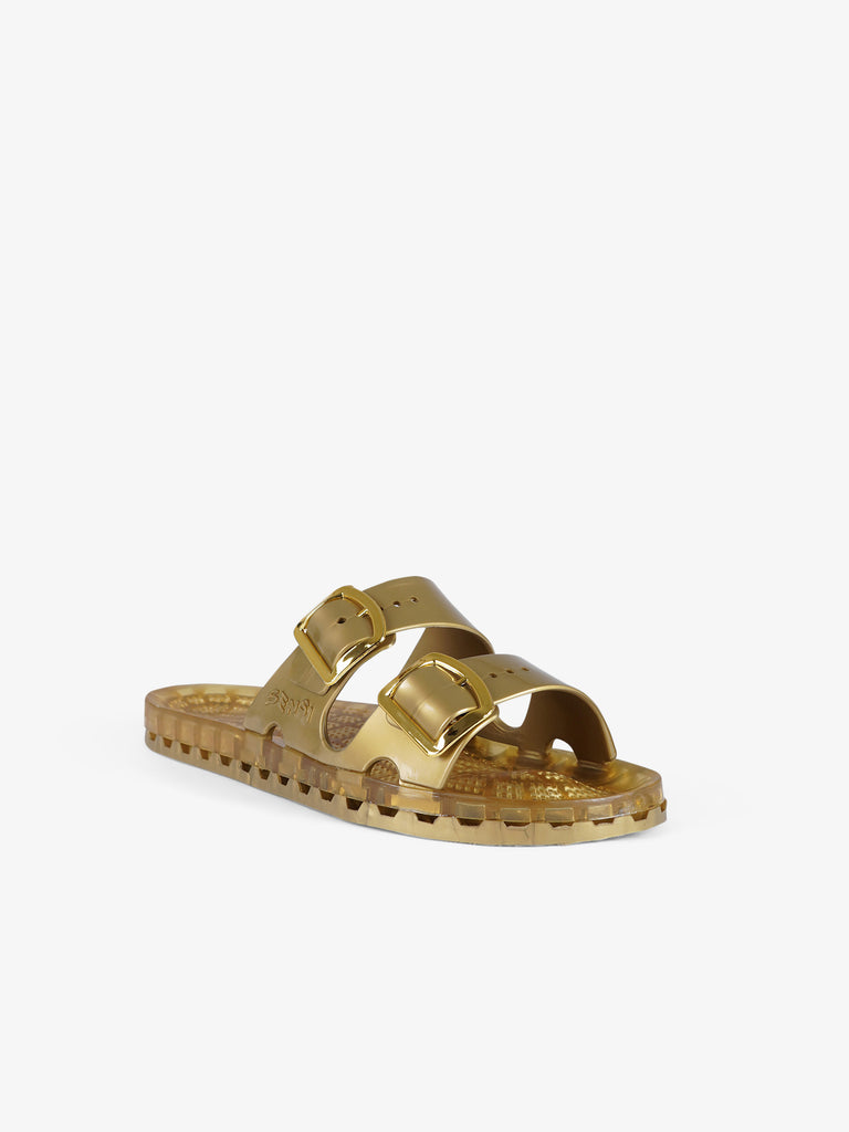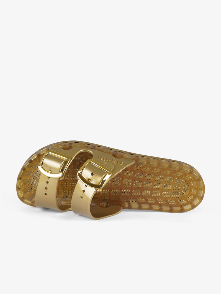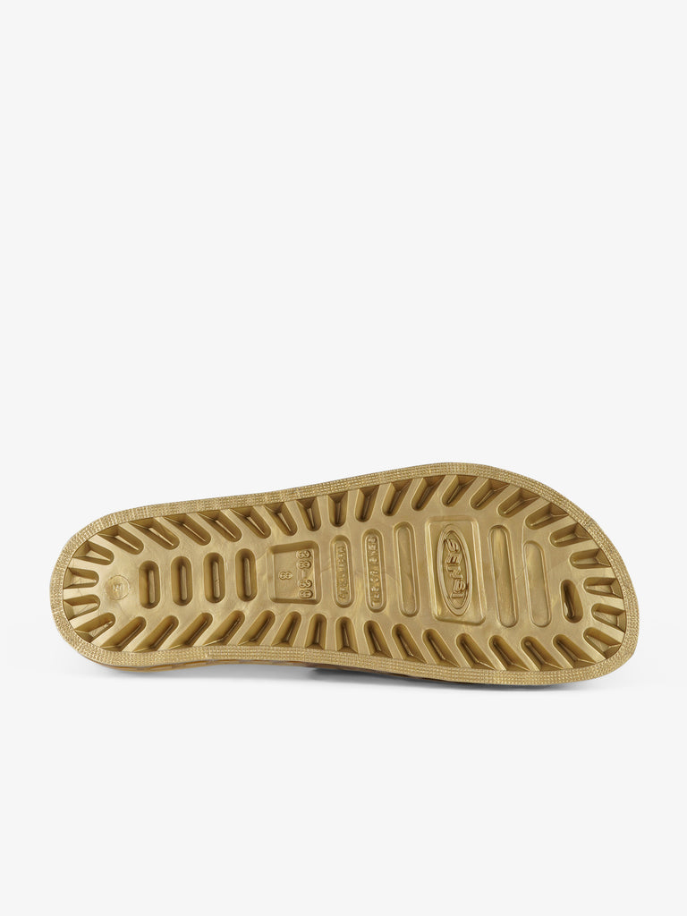 Details: The Jolla Flamingo have a dominant feature; the special PVC sole obtained by mechanically coupling a perforated insole, to a bottom with runoff channels. Holes on the insole communicating with the channels in the bottom allow water to drain away, which through slits along the perimeter of the sandal is expelled outward. The sandals are fully compliant to be recycled once they reach the end of their use with up to 100 percent complete recycling.