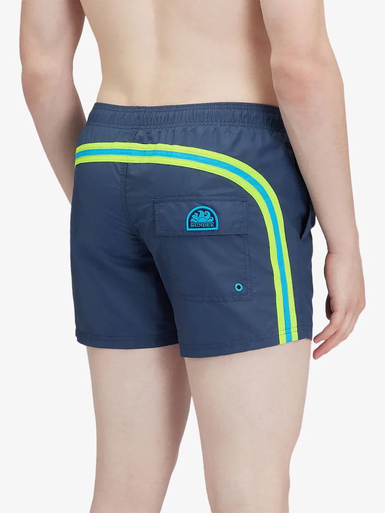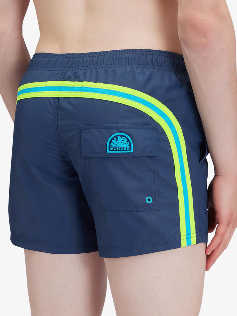Details: Short men's beach shorts with an elasticated waist, drawstring and dual-color Sundek rainbow (2 equal stripes and a third in the middle). This swimsuit is made with three-needle stitching and 100% with our historic fabric, nylon-taffeta: silky smooth, lightweight and resistant to everything, it dries super fast to give you comfort everywhere, in the waves and out of the water.
