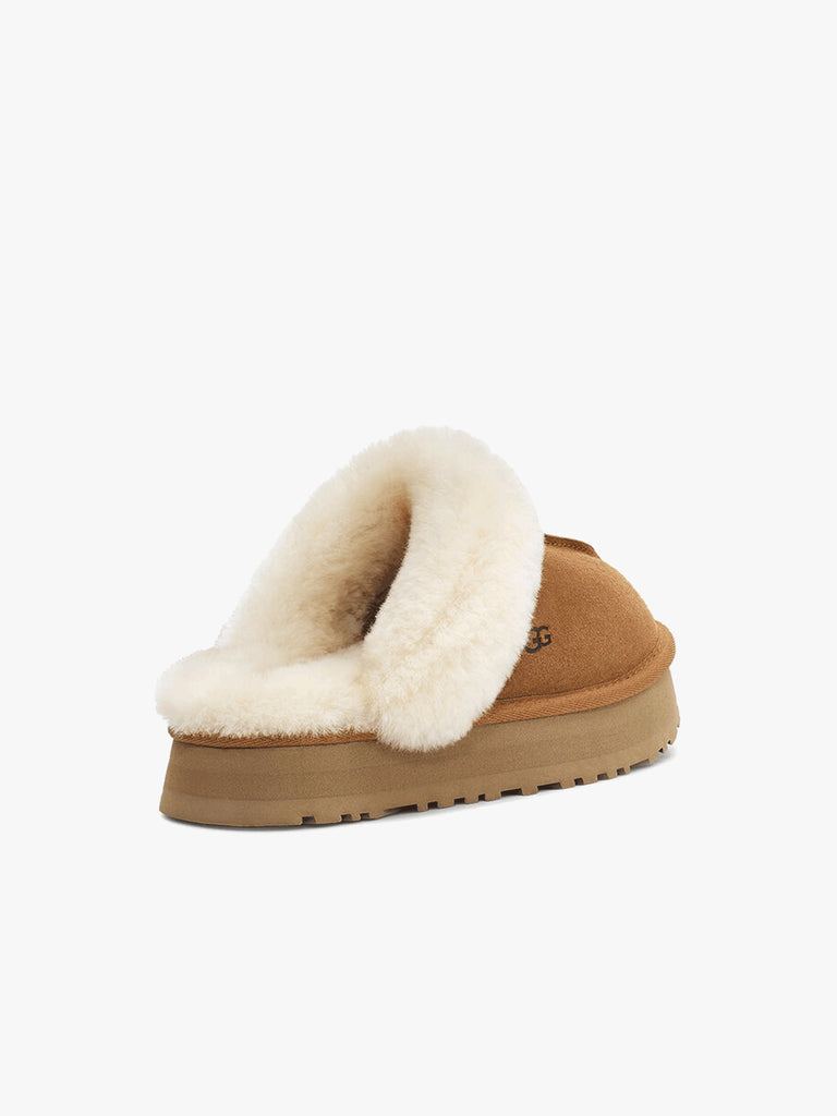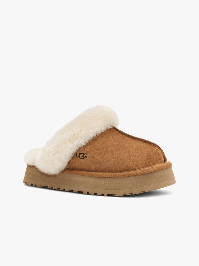 Details: A combination of the Coquette and Disco models for a new, totally unique slipper, the Ugg Disquette sabot adds a retro-style platform to a familiar-looking slip-on for a model you can use outdoors with all-day cushioning and a flashy look. Made in classic sheepskin and suede, this casual style adds a playful touch to all your favorite outfits: try pairing it with a pair of jeans or a floaty longuette dress
