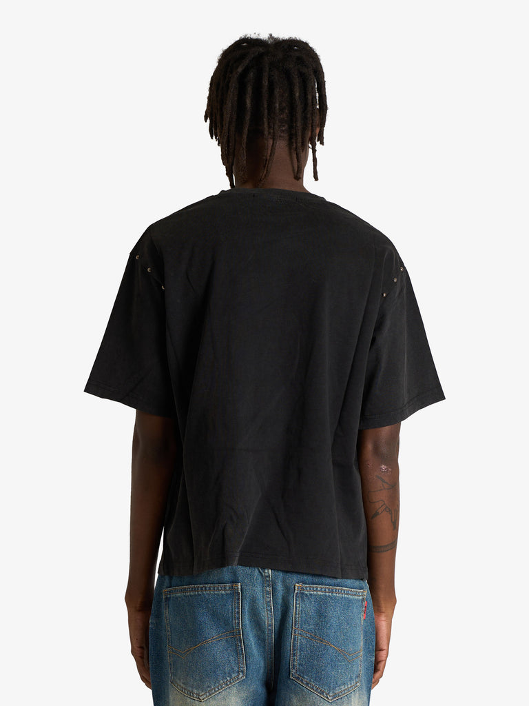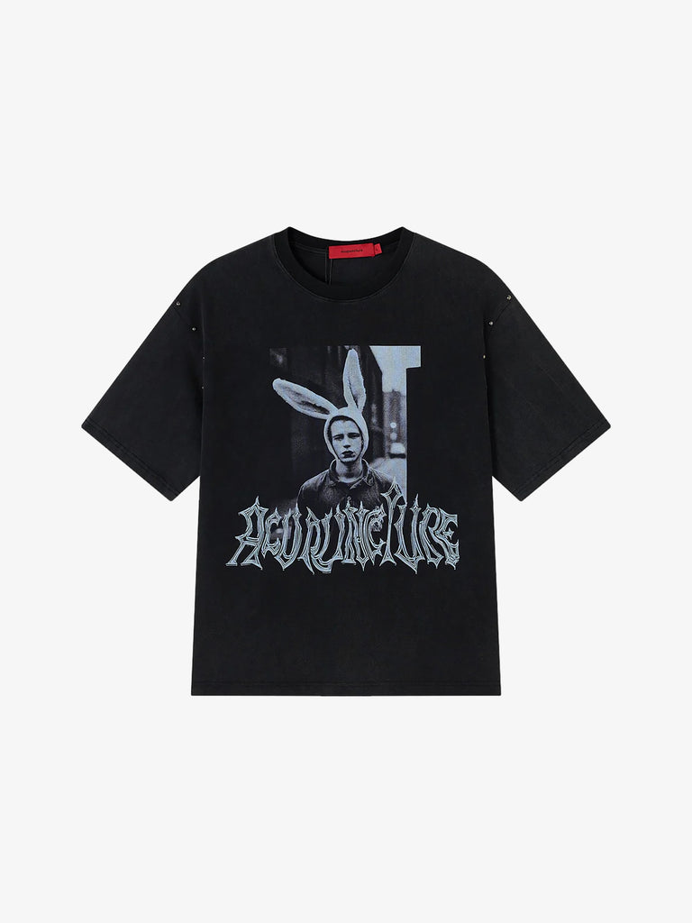 Detalles: Esta camiseta combina un provocativo retrato con orejas de conejo con un logotipo de heavy metal para lograr un atrevido impacto visual. Su silueta cuadrada y el lavado negro desteñido ofrecen un estilo callejero moderno y desenfadado.