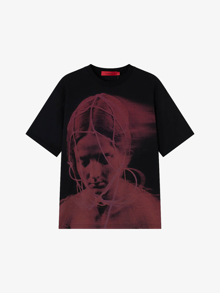 Detalles: Camiseta Trapped: gráfico intenso, atmósfera oscura. El estampado frontal muestra un inquietante retrato rojo atrapado en líneas y movimiento, un poderoso símbolo del espíritu punk moderno. El corte boxy asegura un look contemporáneo y cómodo.