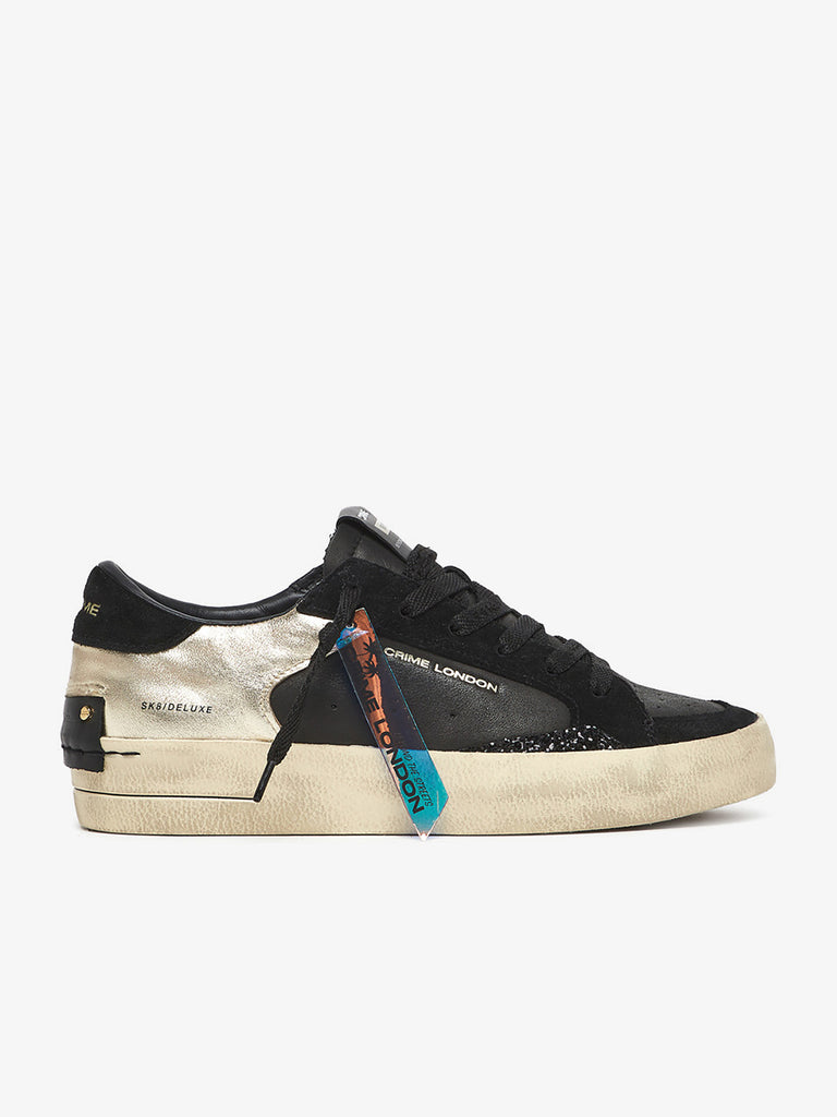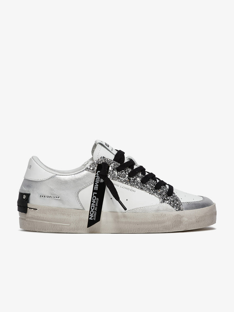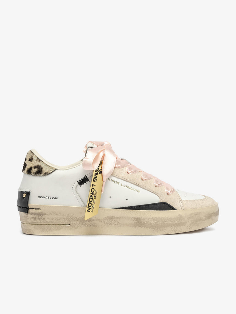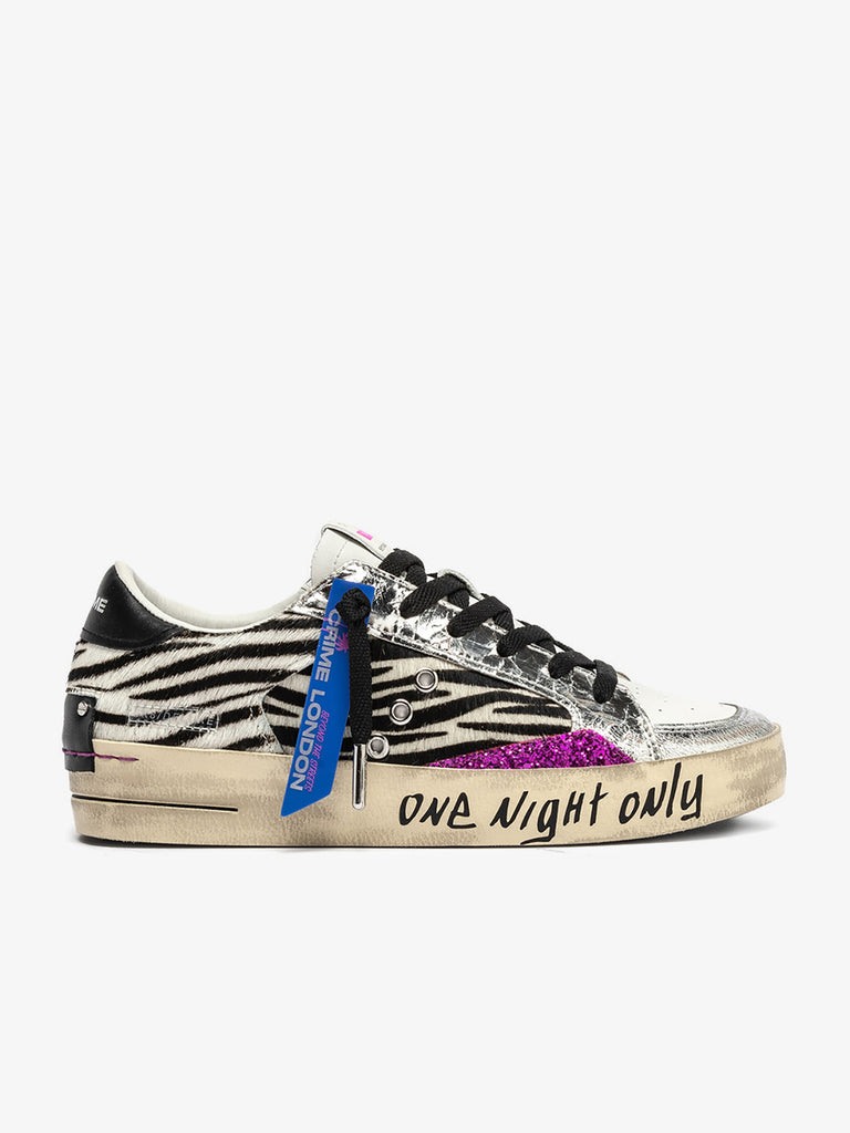 Detalles: Sneaker fabricada con materiales de alta calidad Made in Italy. Parte superior de piel blanca con purpurina plateada, detalles de ante negro. Tacón en piel de poni con estampado de leopardo. Lengüeta de tejido fucsia fluo con etiqueta de logo en piel. Parche de piel negra en la parte trasera. Doble cordón blanco y azul claro con charm CRIME. Etiqueta única de espejo morado. Forro de piel y tela. Suela de piel sintética color marfil, fondo azul claro, altura 2,5 - 3,5 cm. Efecto vintage
