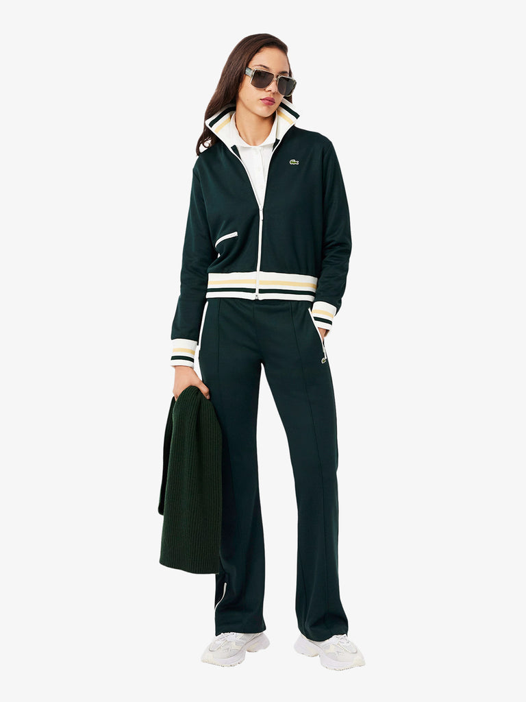 Detalles: Este pantalón de chándal es una versión elegante y sofisticada de la firma Lacoste de un esencial de la ropa deportiva. Confeccionados en piqué interlock con un corte acampanado y sofisticados detalles, como cremalleras en contraste y pliegues delanteros. La unión perfecta entre moda y ropa deportiva, rematada con el icónico cocodrilo bordado.