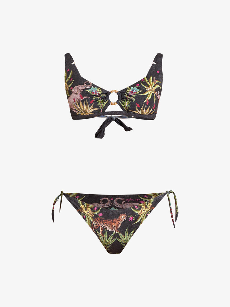 Detalles: Acogedor modelo apto para pechos generosos, el sujetador bikini es sin relleno y con deslizadores dorados que ajustan su sujeción. El aro efecto bambú en el centro del pecho define y realza el modelo. Confeccionado en suave lycra con estampado colocado Safari, el patrón icónico de la marca.