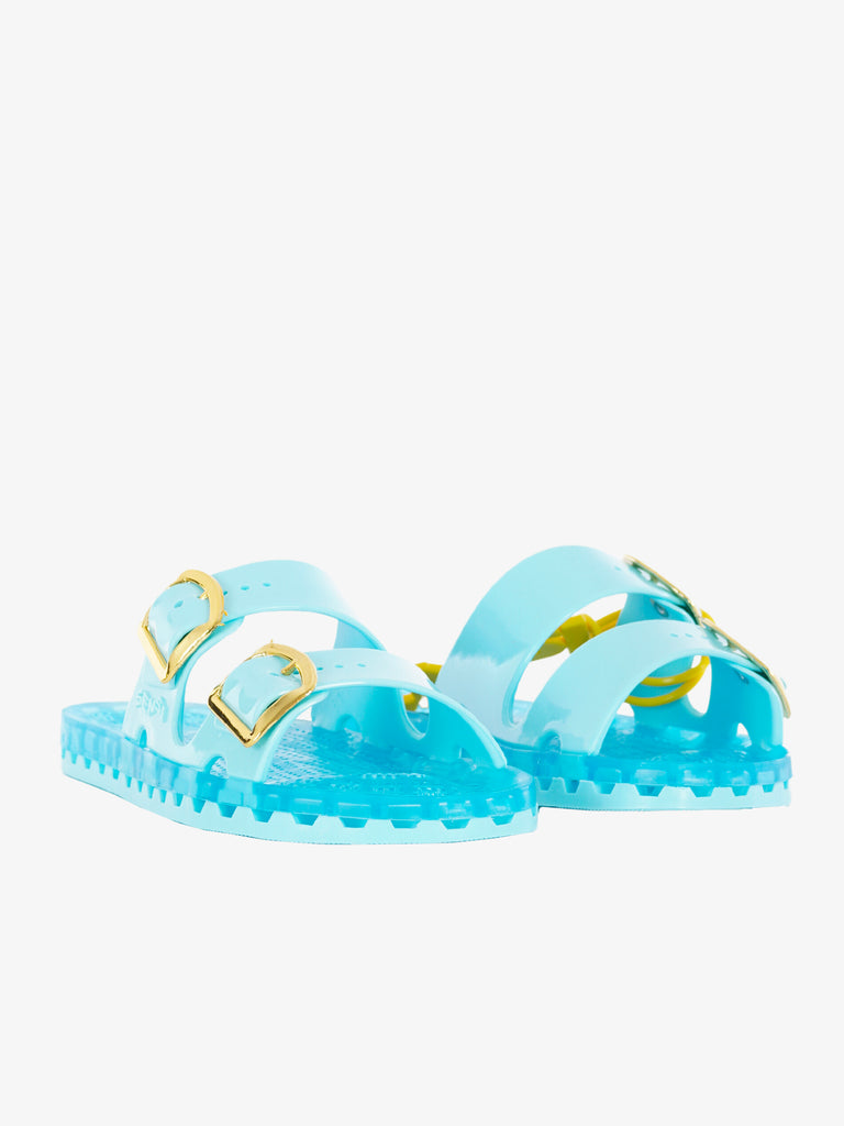 Detalles: Las Jolla Flamingo tienen una característica dominante; la suela especial de PVC obtenida acoplando mecánicamente una plantilla perforada, a un fondo con canales de escurrimiento. Los orificios de la plantilla que comunican con los canales del fondo permiten que el agua se escurra, y a través de unas ranuras a lo largo del perímetro de la sandalia es expulsada hacia el exterior. Las sandalias cumplen todos los requisitos para ser recicladas una vez que llegan al final de su uso, con un reciclado completo de hasta el 100%.