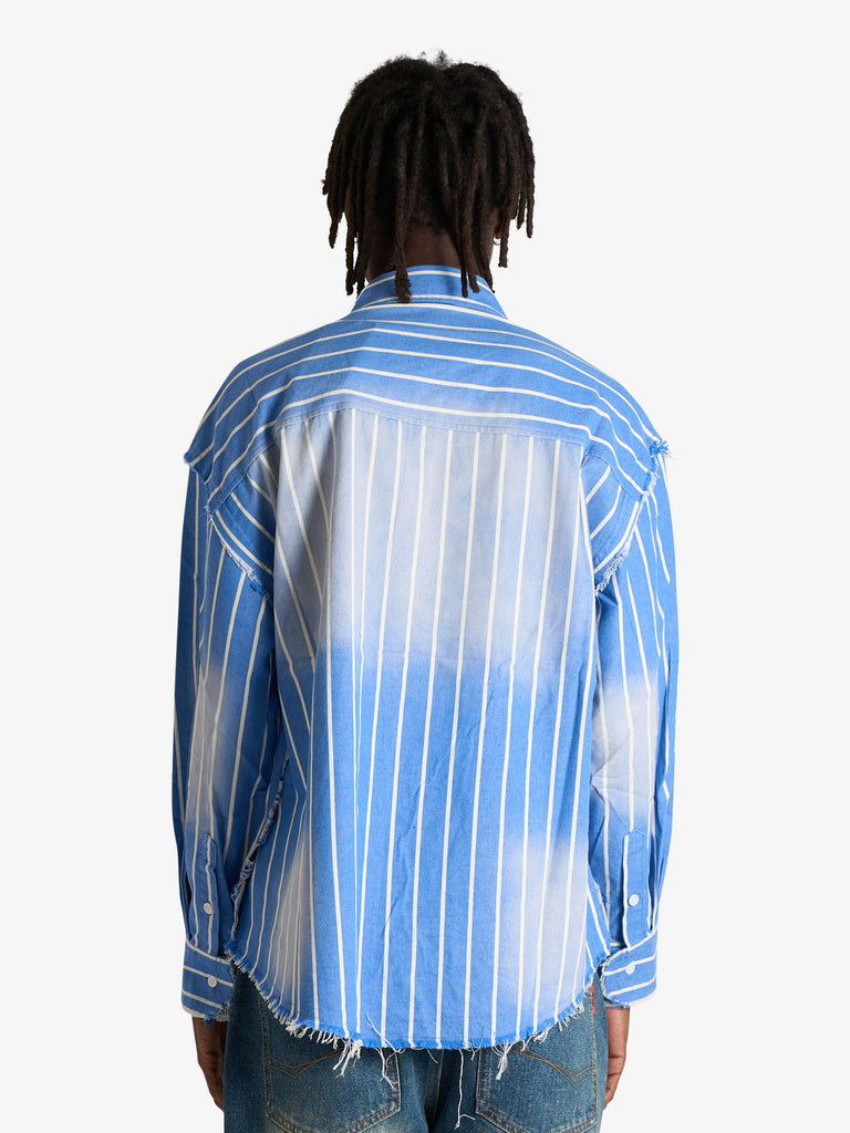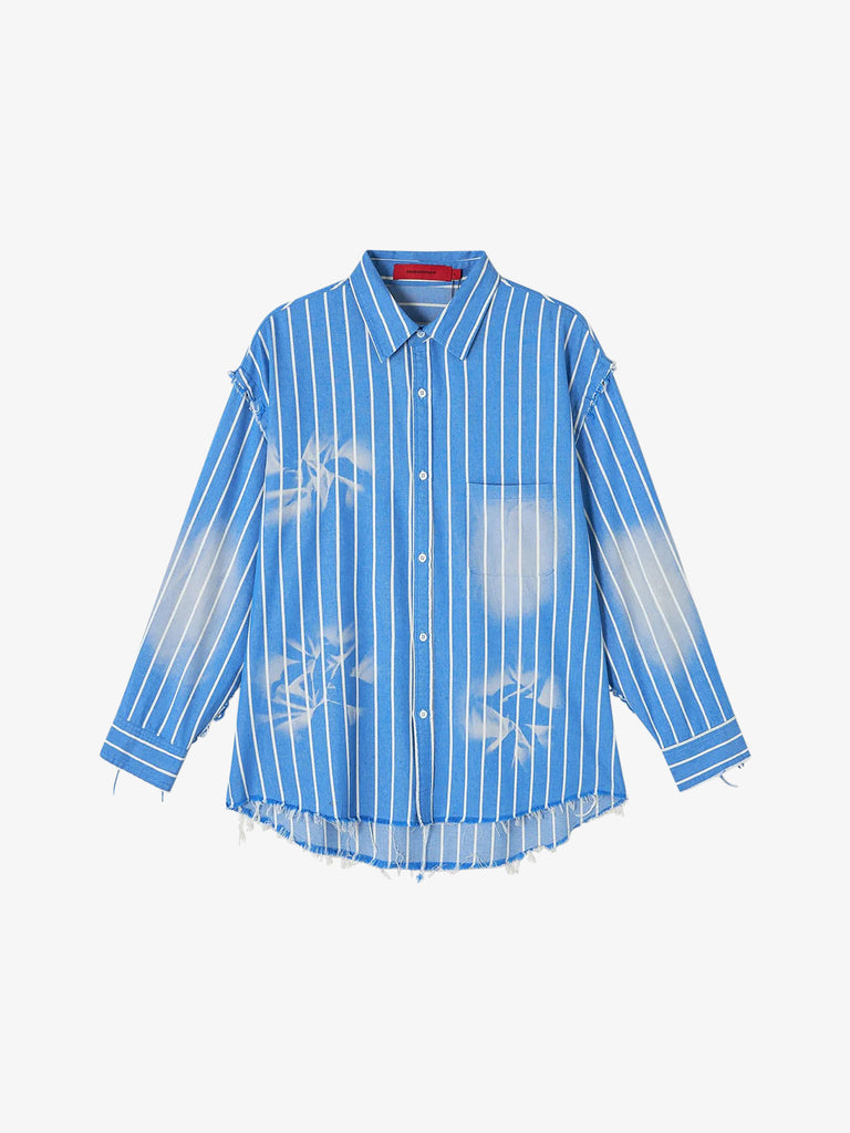 Dettagli: Questo gessato button-down trasforma l'abbigliamento formale in ribellione. Caratterizzata da audaci schizzi di candeggina e bordi grezzi, trasforma una camicia classica in un vero e proprio anti-uniforme. Le linee pulite incontrano il caos controllato in questo pezzo straordinario.