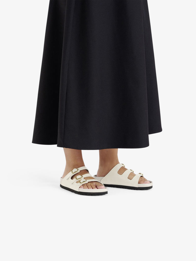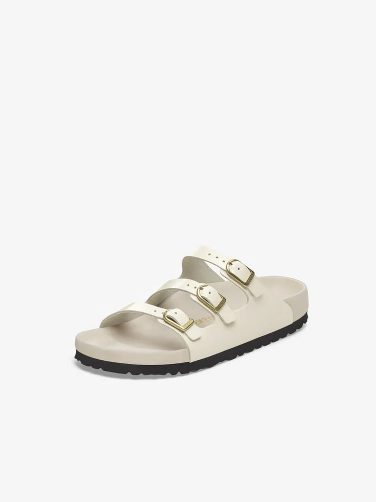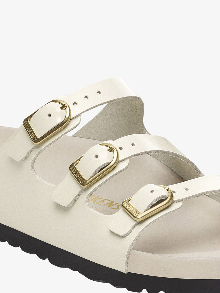 Dettagli: BIRKENSTOCK Florida è il sandalo adatto a chi è sempre in piedi. Questo modello con tre cinturini tiene ben saldo il piede e offre una comodità ottimale. Il plantare exquisit è completamente rivestito in pelle piumato e offre una straordinaria comodità. Le delicate fibbie a D completano l'aspetto elegante del sandalo. La tomaia è in pregiata pelle naturale con una brillante finitura laccata.