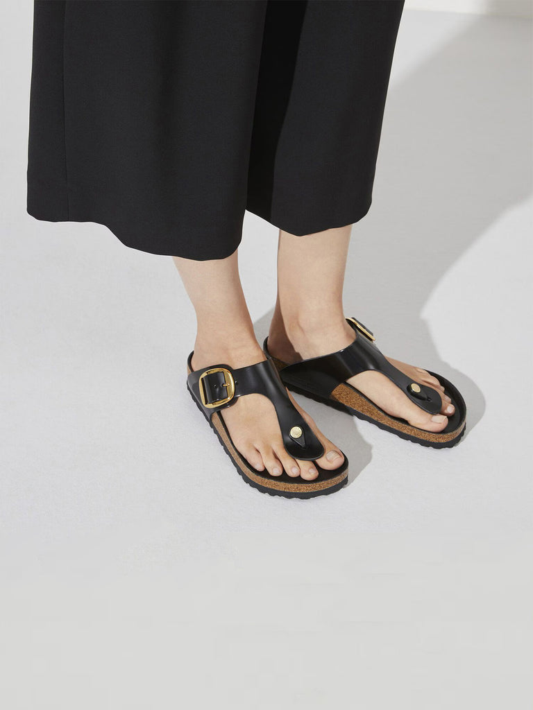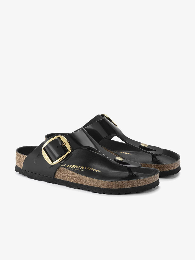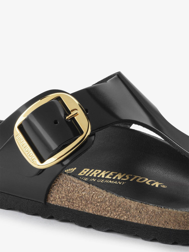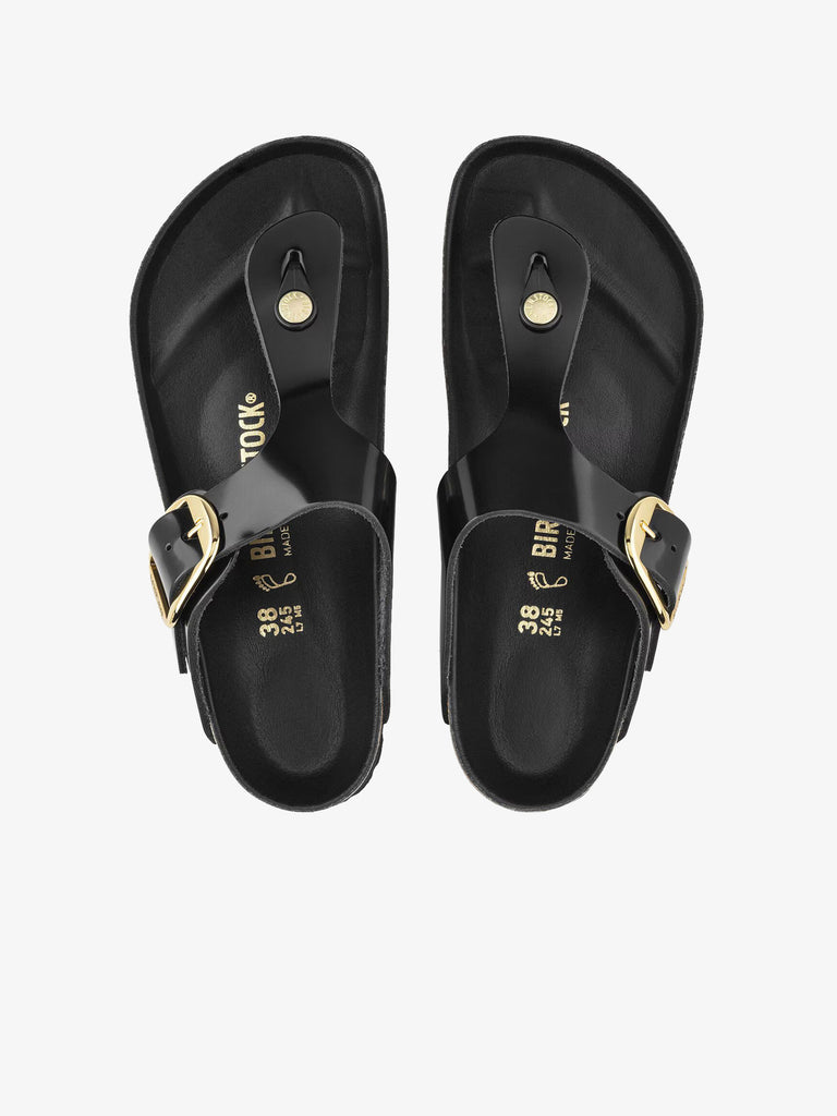 Dettagli: Il modello BIRKENSTOCK Gizeh unisce il design minimalista e alla moda a una stabilità ottimale: un vero classico. La versione Big Buckle presenta una fibbia ad ardiglione grande ed elegante. Il sottopiede del plantare semi-exquisit è completamente rivestito in pelle piumato e offre una straordinaria comodità. La tomaia è in pregiata pelle naturale con una brillante finitura laccata.