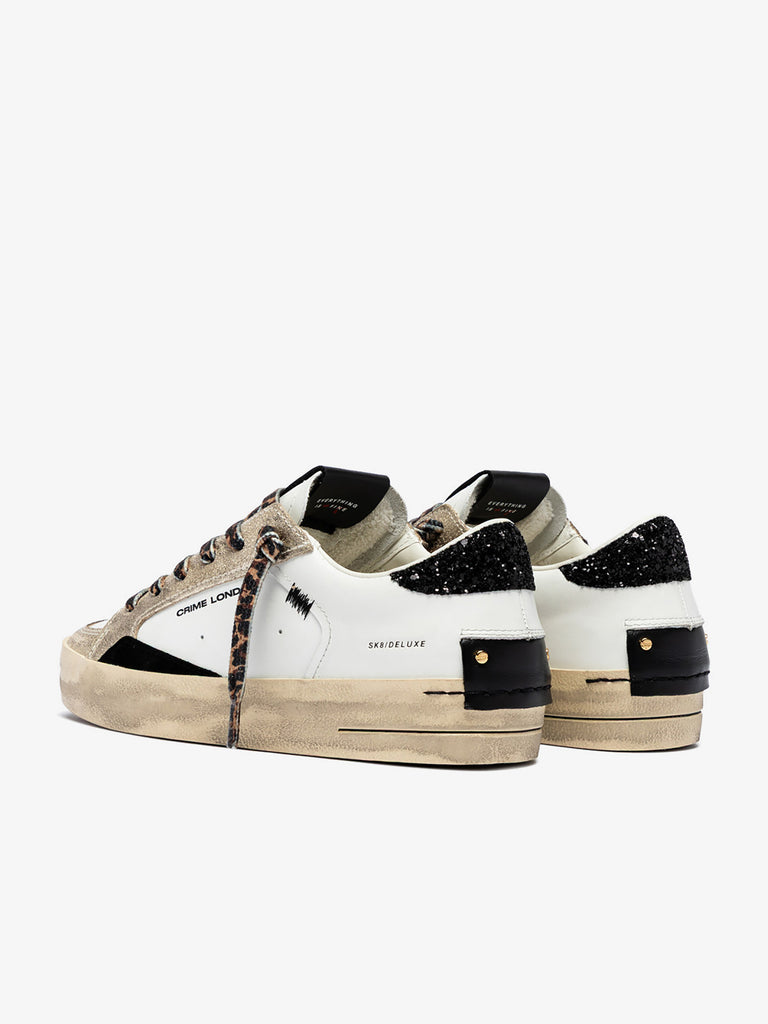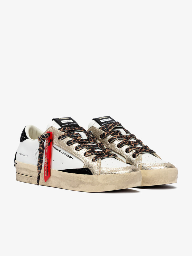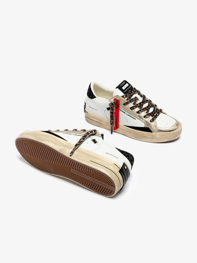 Dettagli: Sneaker realizzata con materiali di alta qualità Made in Italy. Tomaia in pelle bianca con profili laminati, tallone nero e dettagli in oro. Effetto distressed su tomaia e suola. Linguetta con label in pelle logata e testo stampato "Beyond The Streets". Patch in pelle sul retro fissato con micro viti. Lacci. Unico tag logato in gomma. Fodera in pelle e tessuto. Suola in eco-pelle fasciata ivory con lavorazione distressed.