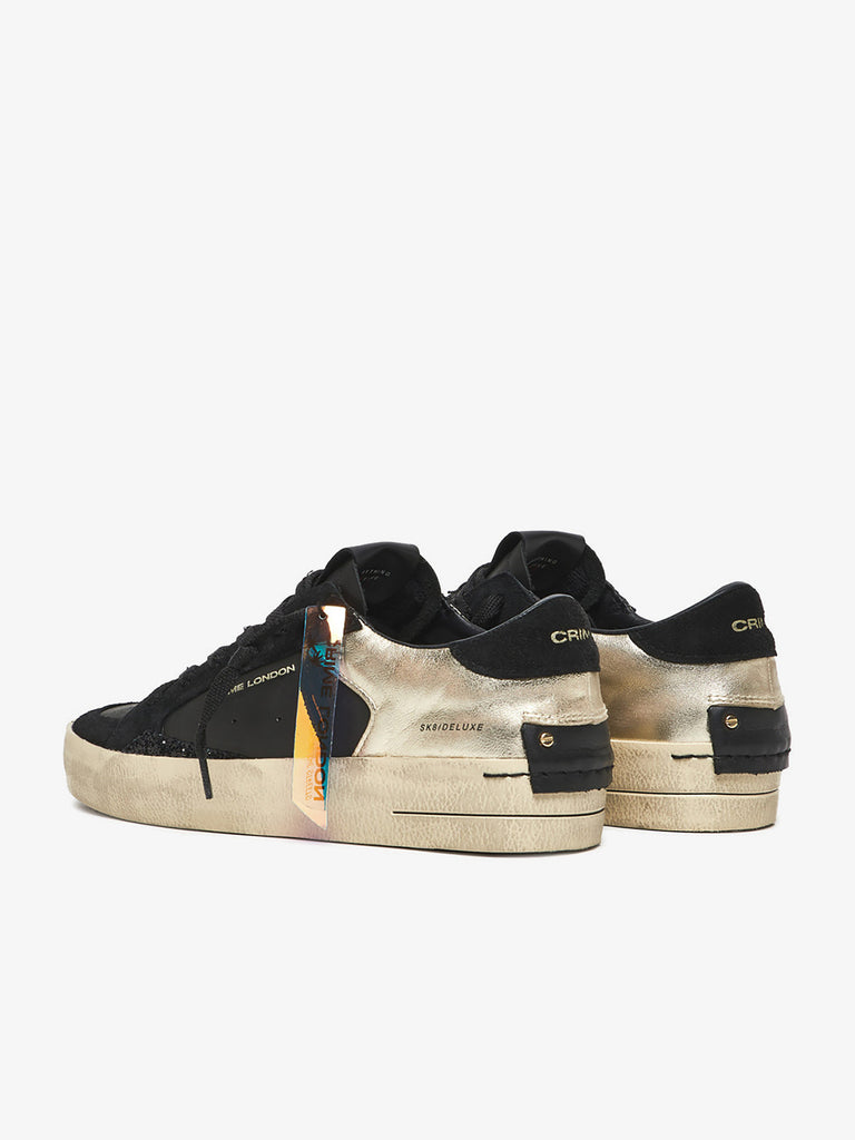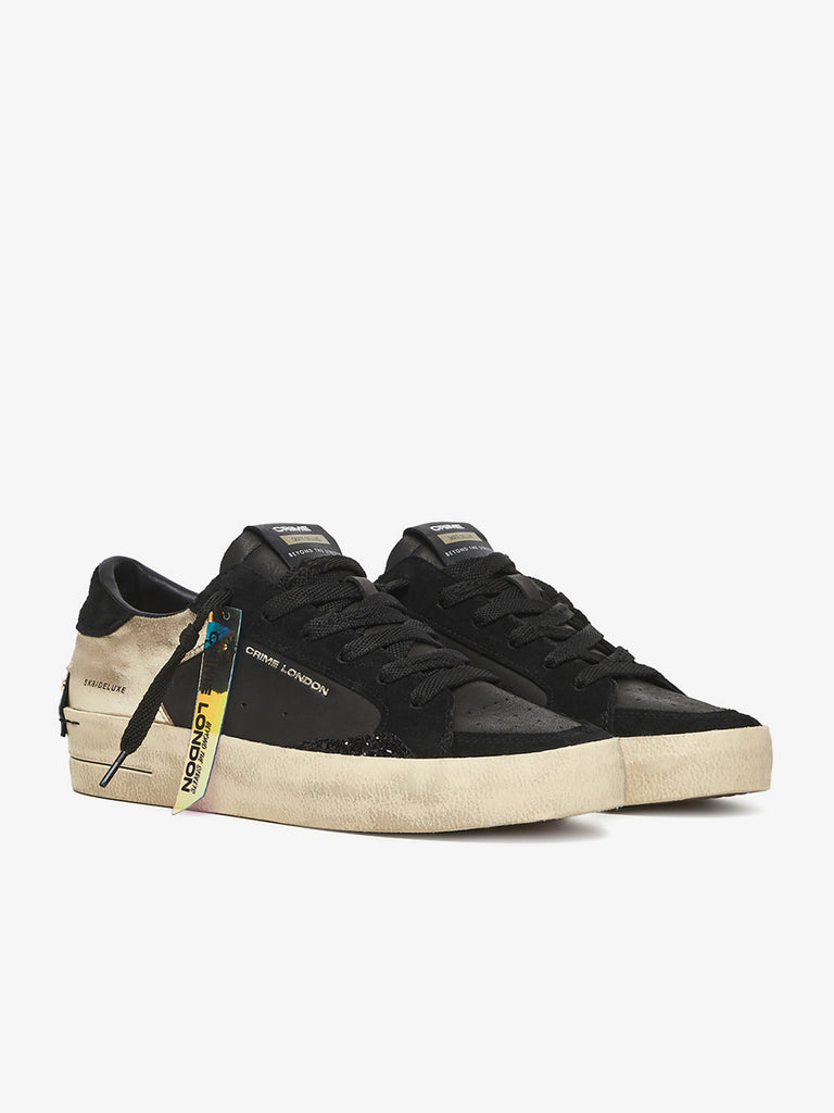 Dettagli: Sneaker realizzata con materiali di alta qualità Made in Italy. Tomaia in pelle nera con profili oro, tallone nero e dettagli in suede. Effetto distressed su tomaia e suola. Linguetta con label in pelle logata e testo stampato "Beyond The Streets". Patch in pelle sul retro fissato con micro viti. Lacci. Unico tag logato in gomma. Fodera in pelle e tessuto. Suola in eco-pelle fasciata ivory con lavorazione distressed.