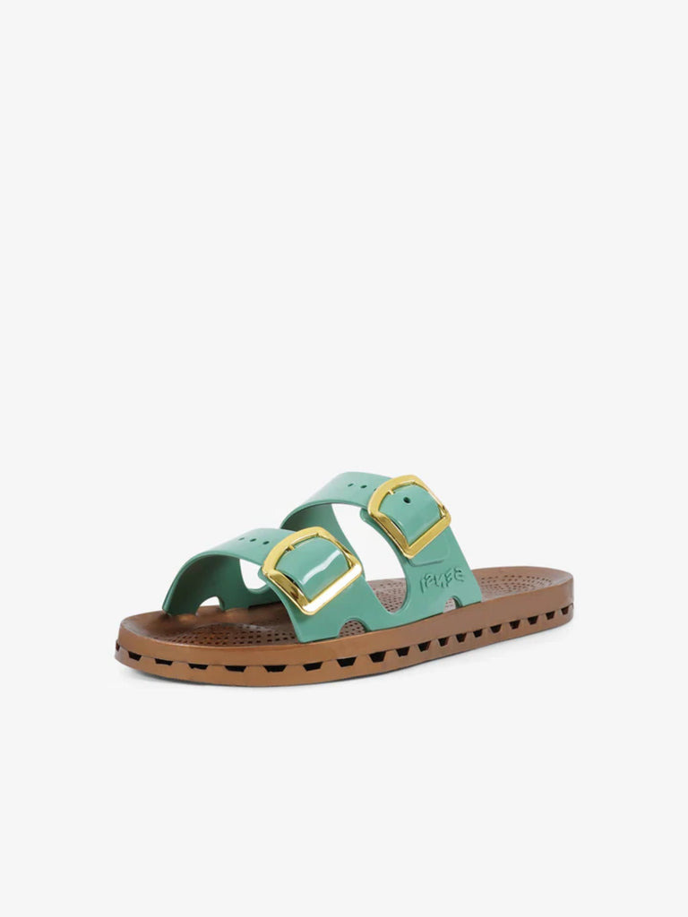 Dettagli: Hanno una caratteristica dominante; la speciale suola in PVC ottenuta dall'accoppiamento meccanico di un sottopiede traforato, ad un fondo con canali di deflusso. I fori presenti sul sottopiede comunicanti con i canali del fondo, consentono lo scarico dell'acqua, che attraverso le feritoie presenti lungo il perimetro del sandalo viene espulsa verso l'esterno. I sandali sono perfettamente conformi per essere riciclati, una volta giunti alla fine del loro utilizzo con un riciclo completo fino al 100%.