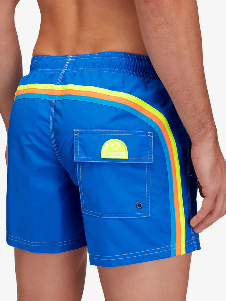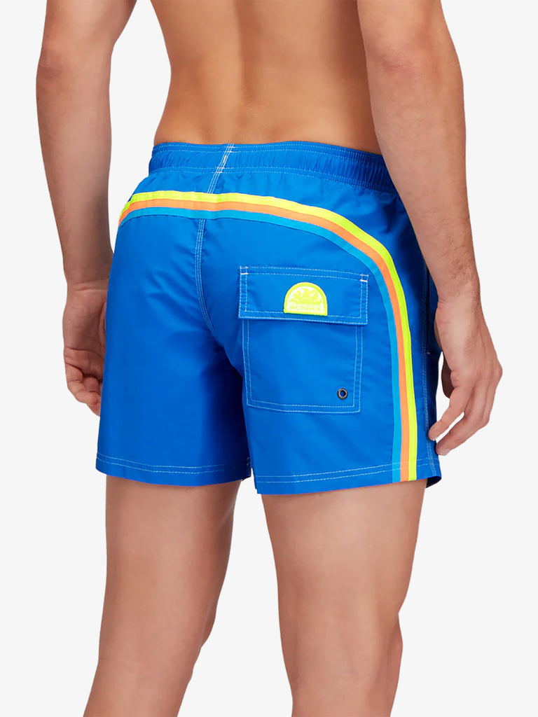 Dettagli: Shorts uomo mare corto e con vita elasticata, coulisse e iconico arcobaleno Sundek sul retro. Questo costume è realizzato con cuciture a tre aghi e al 100% con il nostro tessuto storico, il nylon-taffetà: liscio come la seta, leggero e resistente a tutto, si asciuga velocissimo per darti comodità ovunque, tra le onde e fuori dall'acqua.
